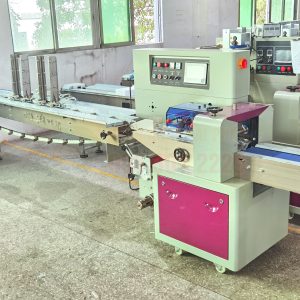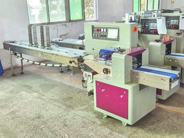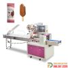 Nguyên lý hoạt động: Sản phẩm được đặt trên một băng tải và di chuyển theo chiều ngang. Một cuộn màng liên tục được kéo ra, bao bọc quanh sản phẩm. Máy sẽ thực hiện 3 đường hàn: một đường hàn dọc ở mặt dưới và hai đường hàn ngang ở hai đầu của gói sản phẩm.