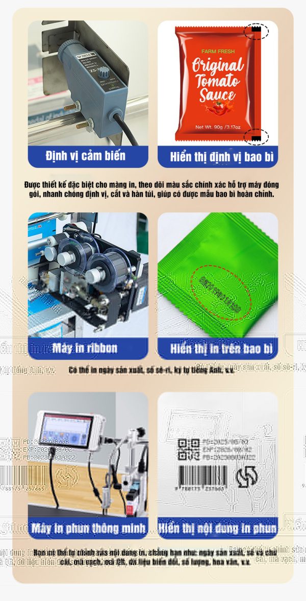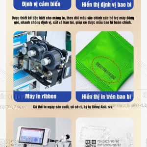 - Các bộ phận tùy chọn: Một số máy có thể được trang bị thêm bộ phận in date (ngày sản xuất, hạn sử dụng), bộ phận cắt định hình (cắt túi theo các hình dạng đặc biệt), hoặc hệ thống hút bụi (đối với sản phẩm dạng bột).