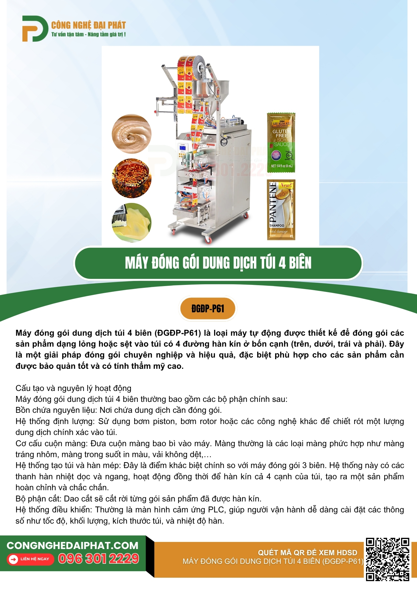 Chi tiết về sản phẩm Máy đóng gói dung dịch túi 4 biên (ĐGĐP-P61) xin vui lòng liên hệ Hotline để được tư vấn hoàn toàn miễn phí