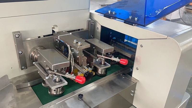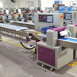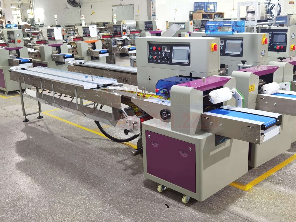 Máy đóng gói mứt kẹo (ĐGĐP-P49) là loại máy phổ biến nhất trong ngành bánh kẹo. Sản phẩm được đưa lên một băng tải theo chiều ngang, sau đó được bọc trong một cuộn màng liên tục. Máy sẽ tạo 3 đường hàn kín: một đường hàn dọc ở mặt dưới và hai đường hàn ngang ở hai đầu của gói sản phẩm.