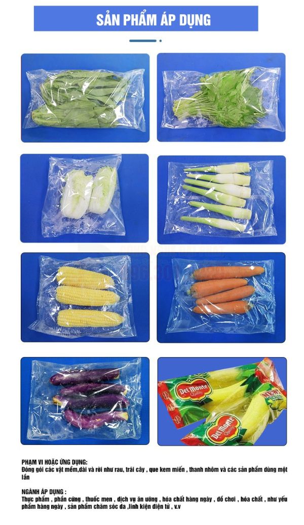 Máy này lý tưởng để đóng gói các sản phẩm có hình dạng khối hoặc bán khối, từ các loại rau củ đơn lẻ như cà rốt, dưa chuột, ớt chuông, cho đến các loại rau ăn lá hoặc bó hành ngò.