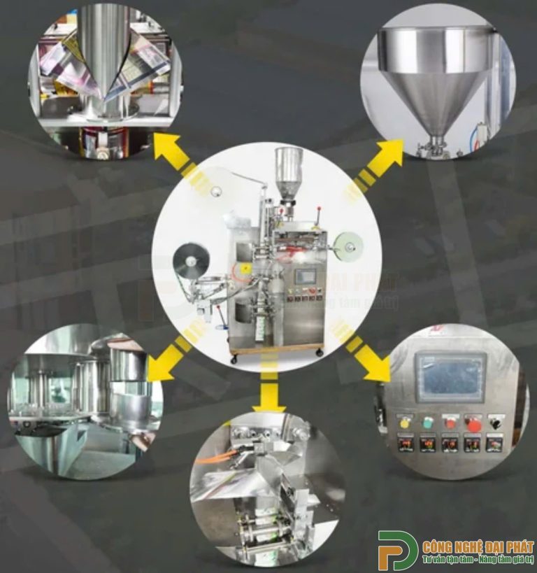 1. Định lượng trà (Filling): Tự động cân hoặc định lượng thể tích chính xác lượng trà (thường từ 2g – 3g) cho mỗi túi lọc.