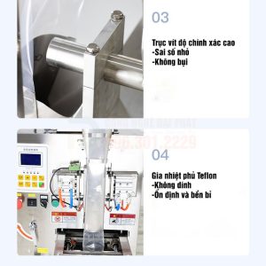 - Sau khi sản phẩm được trục vít xả vào túi, bộ phận hàn nhiệt sẽ hàn kín miệng túi và dao cắt sẽ cắt rời túi thành phẩm.