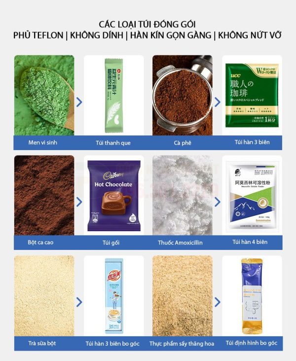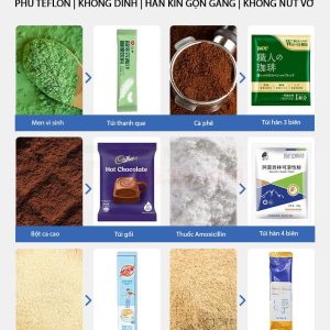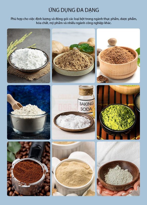 - Thực phẩm: Bột cà phê, sữa bột, bột mì, bột gạo, bột gia vị, bột nêm, bột canh, bột cacao.