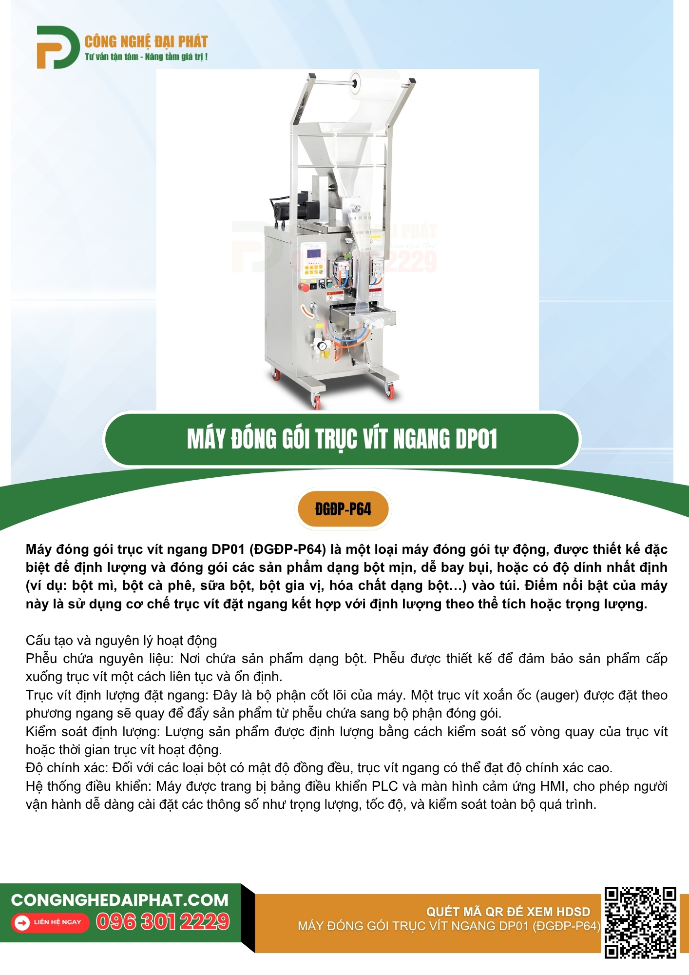 Máy đóng gói trục vít ngang DP01 (ĐGĐP-P64) là một loại máy đóng gói tự động, được thiết kế đặc biệt để định lượng và đóng gói các sản phẩm dạng bột mịn, dễ bay bụi, hoặc có độ dính nhất định (ví dụ: bột mì, bột cà phê, sữa bột, bột gia vị, hóa chất dạng bột…) vào túi. Điểm nổi bật của máy này là sử dụng cơ chế trục vít đặt ngang kết hợp với định lượng theo thể tích hoặc trọng lượng.