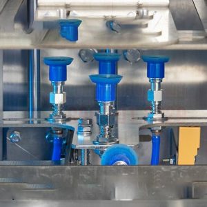 - Định vị: Túi được đưa đến vị trí dưới vòi chiết rót hoặc cửa xả của hệ thống định lượng.