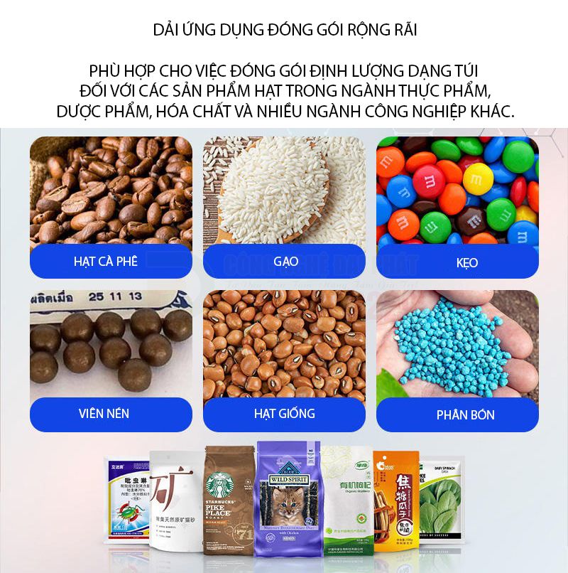 - Thực phẩm: Đóng gói cà phê hòa tan, các loại hạt (hạt điều, hướng dương), ngũ cốc, bánh kẹo, trà, gia vị, snack.