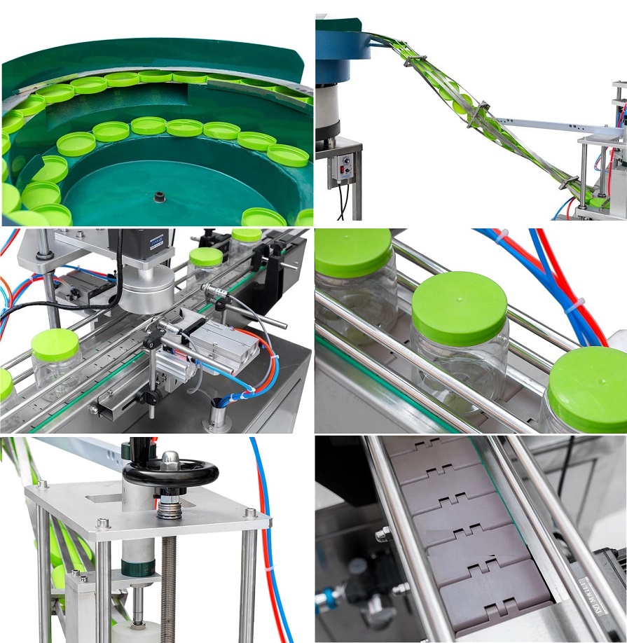 Cơ chế: Chai đi qua một hệ thống gồm 2 hoặc 3 cặp bánh răng cao su (con lăn) xoay ngược chiều nhau để siết chặt nắp.